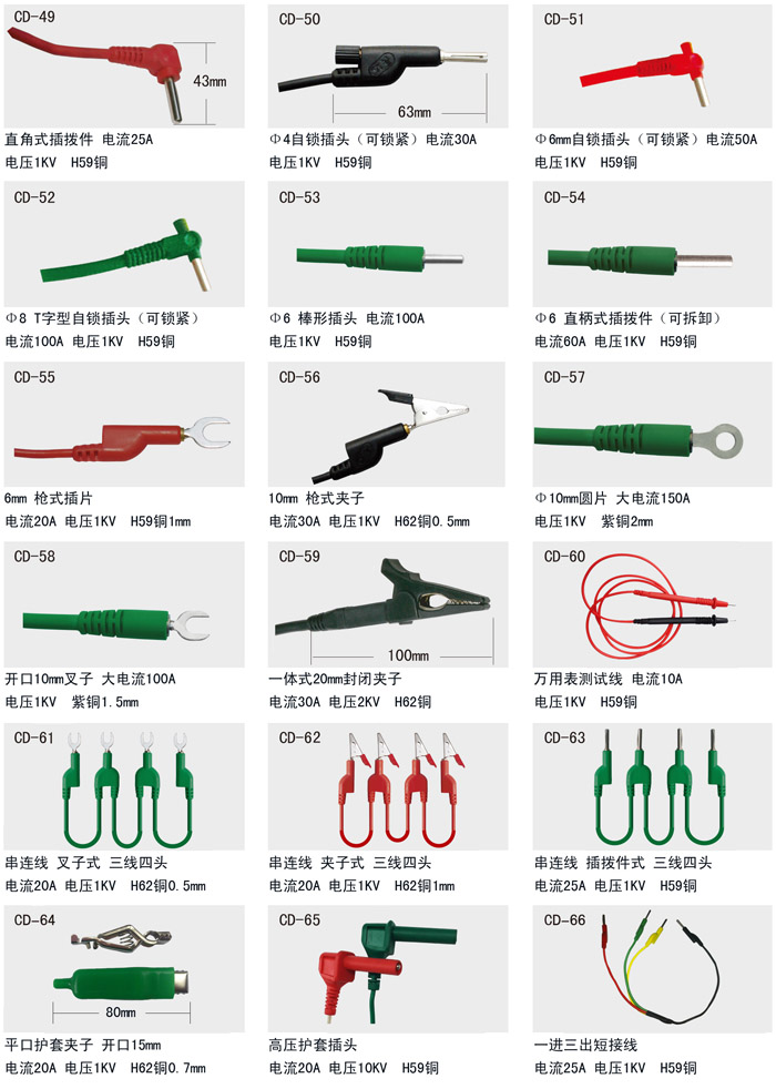 CD系列多功能接插件參照國際通過款式規(guī)格、采用具有一定硬度的優(yōu)質(zhì)銅材精制而成、具有接觸性好、使用方便靈活、經(jīng)久耐用之優(yōu)點,并帶有絕緣手柄和接插孔,可根據(jù)使用電流大小任意選擇。