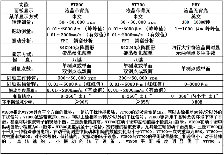 7. VT700動平衡測量儀與PHY動平衡測量儀的區(qū)別,VT700屏幕中文顯示,PHY屏幕英文顯示,VT700液晶帶背光圖文顯示比PHY清晰,利于一般工人操作。VT700測量精度比PHY精度高。PHY可以交直流兩用,VT700只能用交流電。PHY一幅顯示A.B二面參數(shù),VT700二幅顯示A.B二面參數(shù)。PHY具有配重向左右選定角度計算能力,適用葉輪動平衡計算。VT700可以對有差轉(zhuǎn)速復(fù)合旋轉(zhuǎn)體進行動平衡,VT700的選頻性能優(yōu)于PHY。