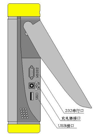 儀器的右側視圖如右圖,在后支架打開時,可露出下部的其他接口部分,